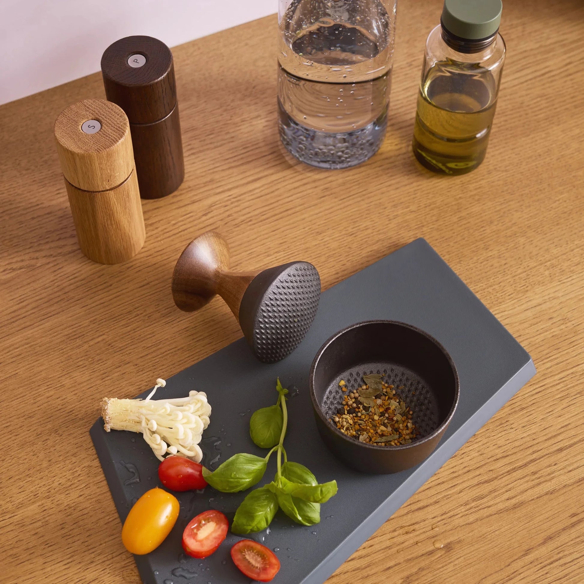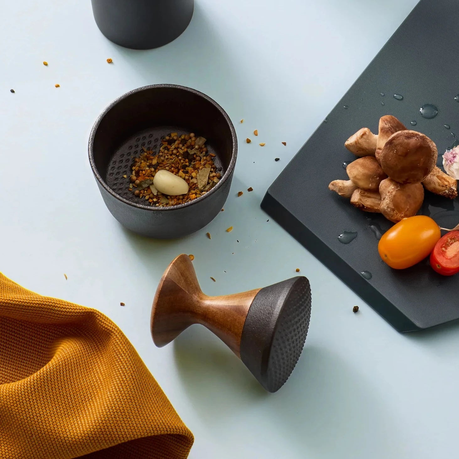 Reduziert, funktional und massiv: Der Mörser aus Gusseisen mit Stößel aus Akazienholz verbindet ehrliche Materialien mit klarem Design – für aromatisches Mahlen.